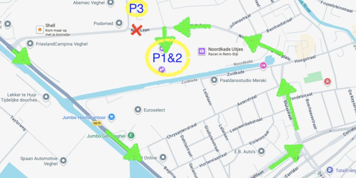 P1 en P2 zijn bereikbaar via de groene pijlen op de afbeelding.